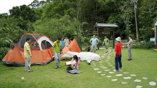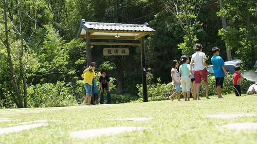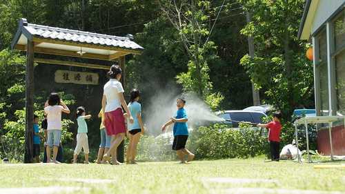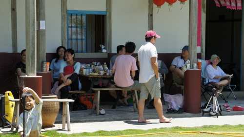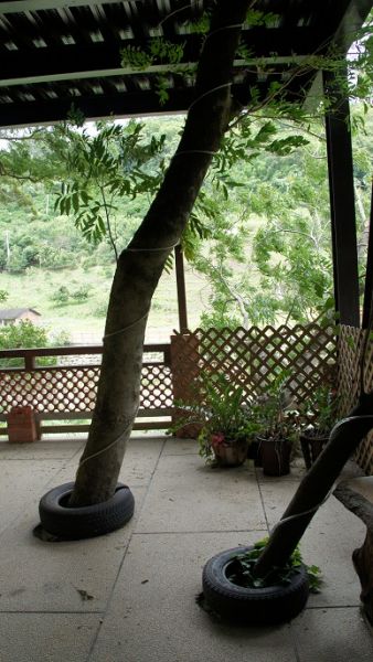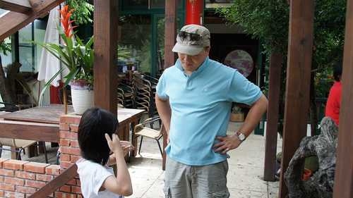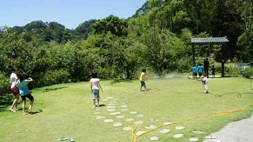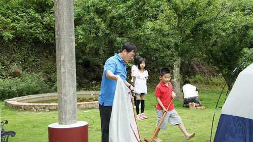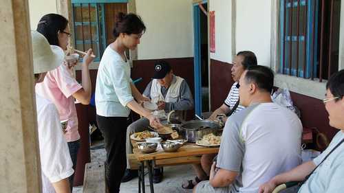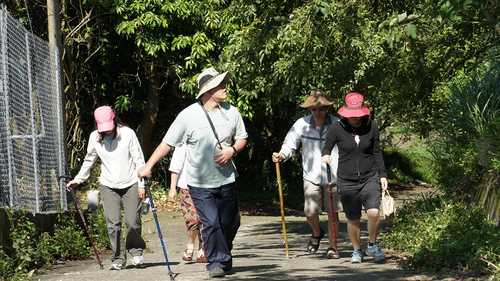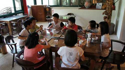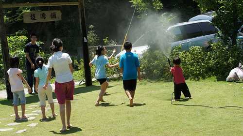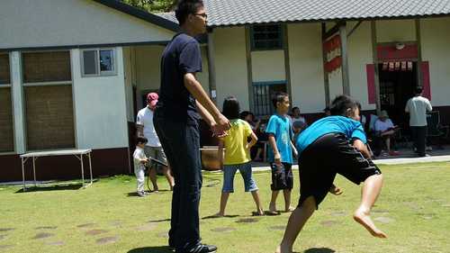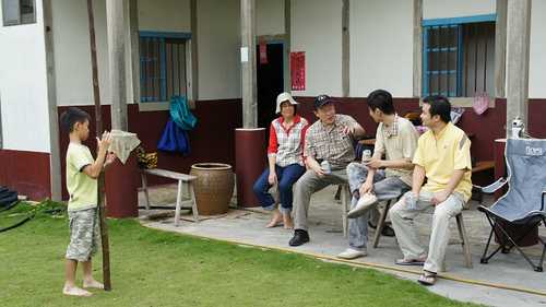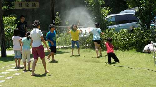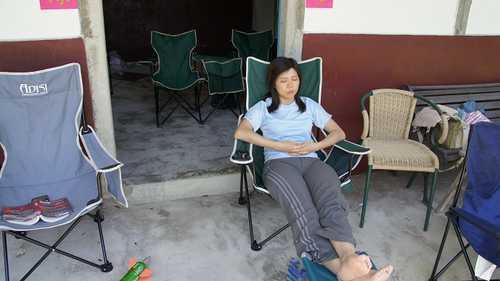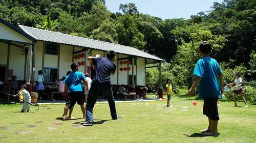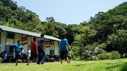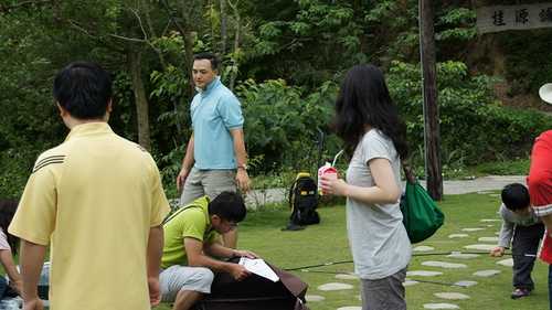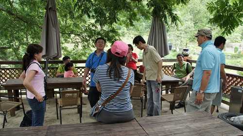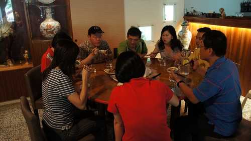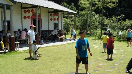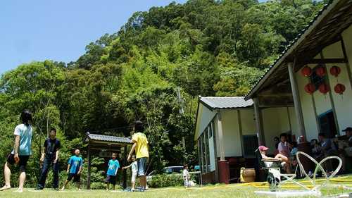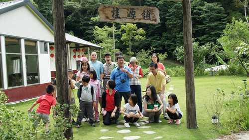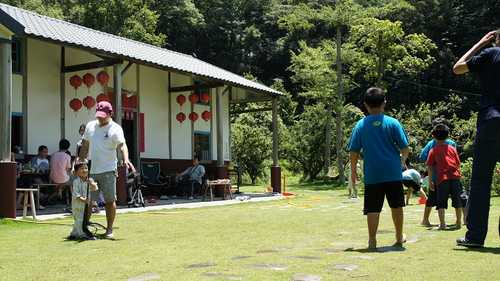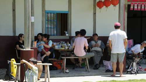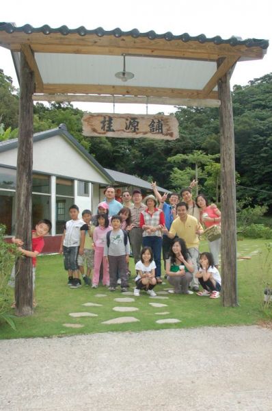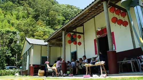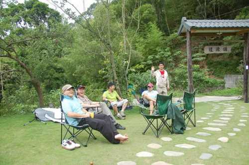 大夥們吃飽飯後正在餐廳門口的涼亭吹風聊天,大家有說有笑的