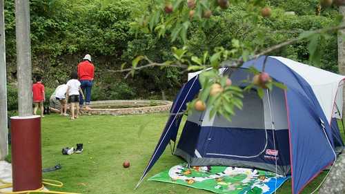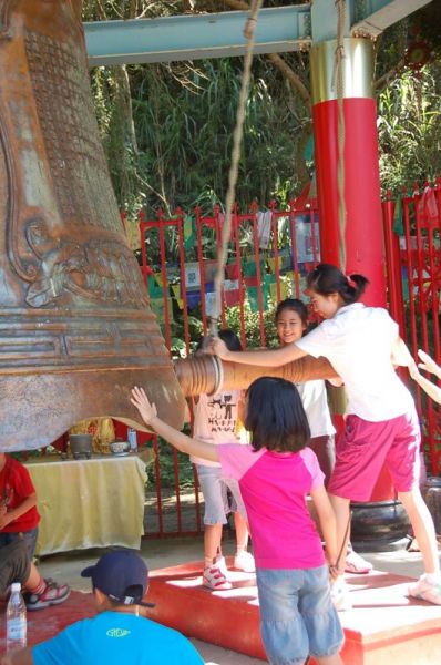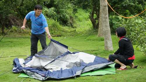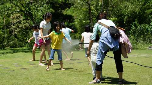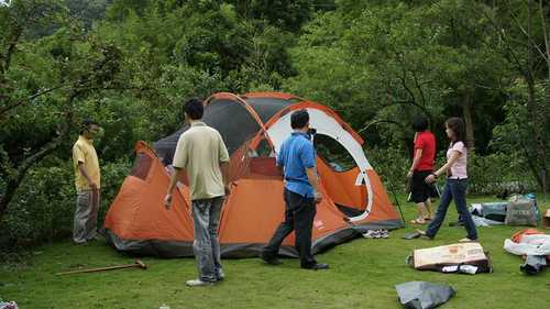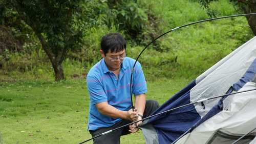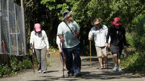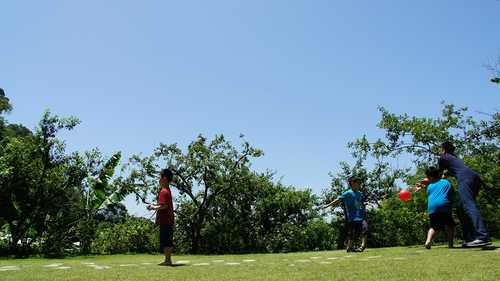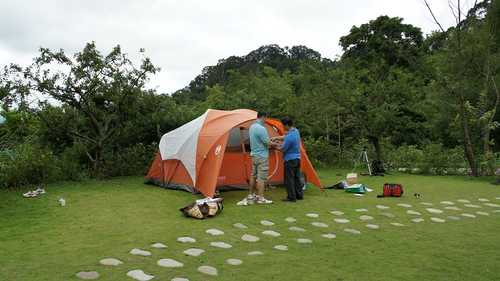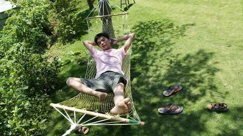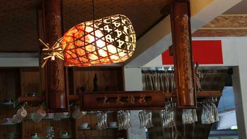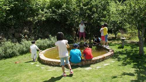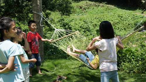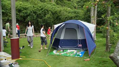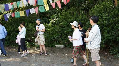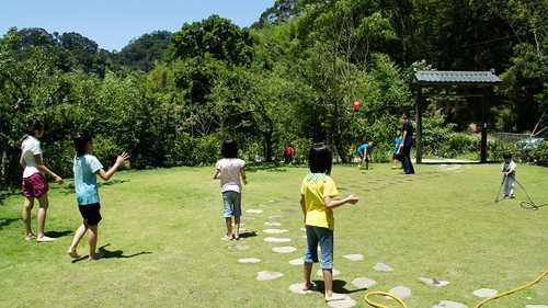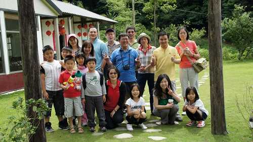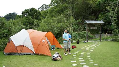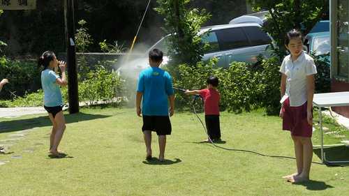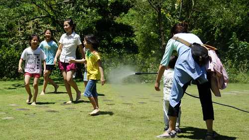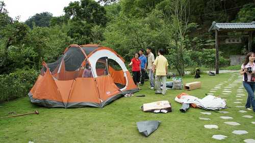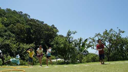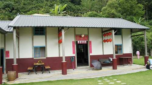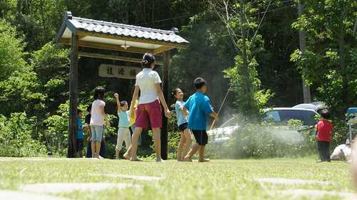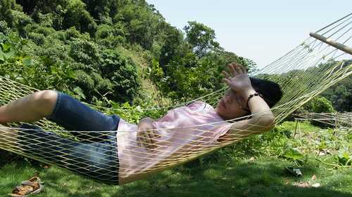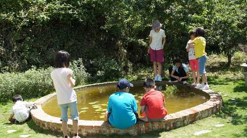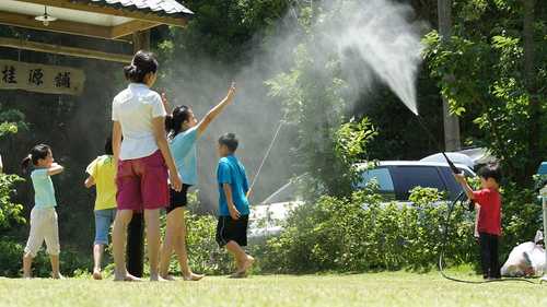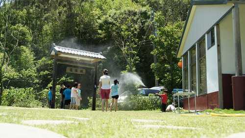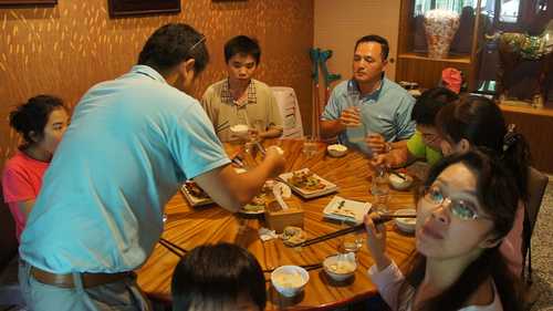 大夥們吃飽飯後正在餐廳門口的涼亭吹風聊天,大家有說有笑的