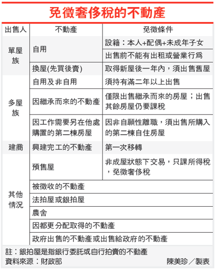 還有哪種形態的不動產出售時不會被課奢侈稅?財政部說,「先買後賣」的換屋族,只要在購入新屋完成移轉登記日起算一年內,出售舊屋,即使持有舊屋未滿二年也免課。農舍、預售屋、繼承而來的房屋、被徵收的房屋、法拍屋或銀拍屋、非自願離職須出售新購入的房屋,以及建商興建完工後首次出售的不動產,都不課徵奢侈稅。