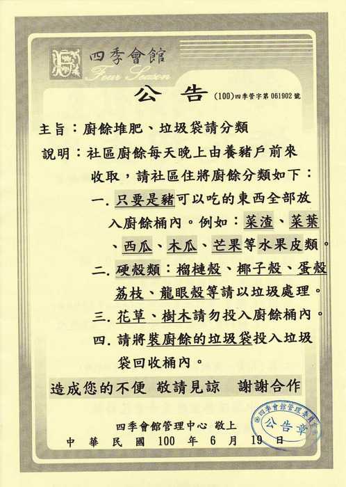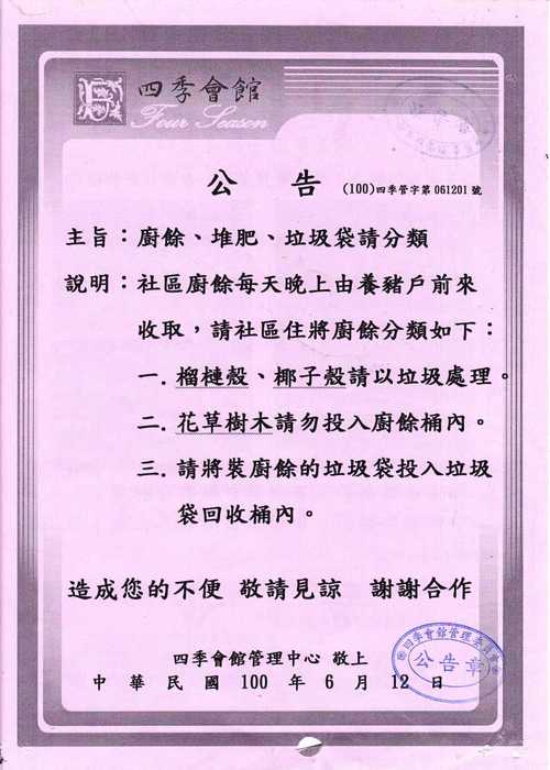 我們把它公告跟張貼在回收區,這樣大家比較好遵守,