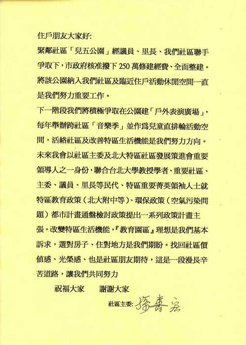 也由衷希望社區住戶若願意的話,直接與主委接觸共同為社區的長久奮鬥....