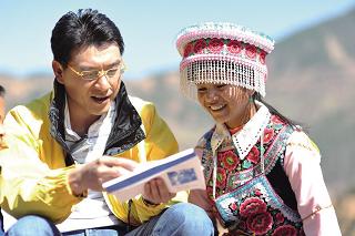 謝震武以2011年奧比斯光明大使的身分到雲南參與救盲任務,和接受手術後重拾健康視力的少女羅成麗開心互動。