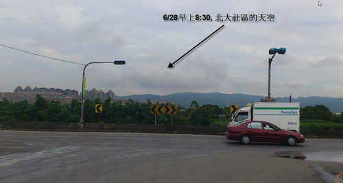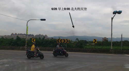 6/28今早,我帶著趕著上班的心情出門,經過三峽瀝青廠,發現早上沒有拆除的動作,想說,好吧,就等一下吧.看拆除工人是否會來.等著等著,看到北大社區的上空,疑~~ 怎麼黑黑的.. 請看下圖...