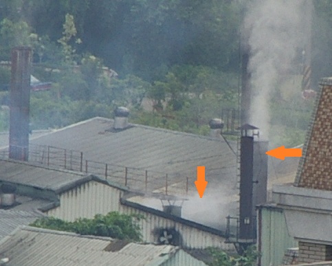 圖二:放大圖(黃色箭頭處,就是正在排放的煙囪)