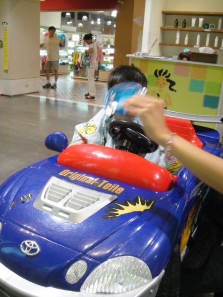有次去橘子吃早餐,回來時經過國學街上的尚田,裡面就有車子造型的剪髮椅,但是剪髮時,車子會被那件擋頭髮的布蓋住,所以就不能看到車子,要不斷跟小孩說,剪好就可以再玩了。那天大少馬上就乖乖的剪頭髮了。