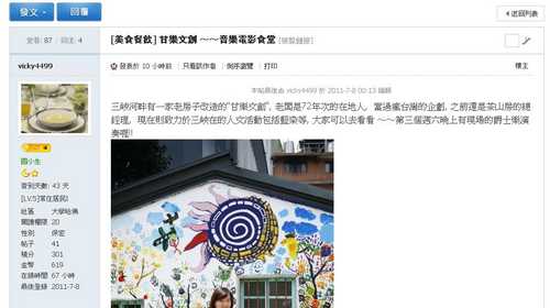 三峽河畔有一家老房子改造的"甘樂文創", 老闆是72年次的在地人, 當過瘋台灣的企劃, 之前還是茶山房的總經 ...