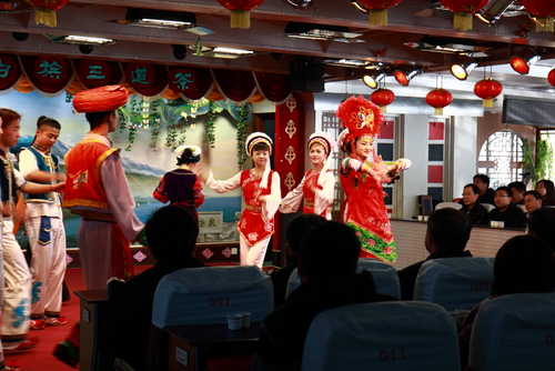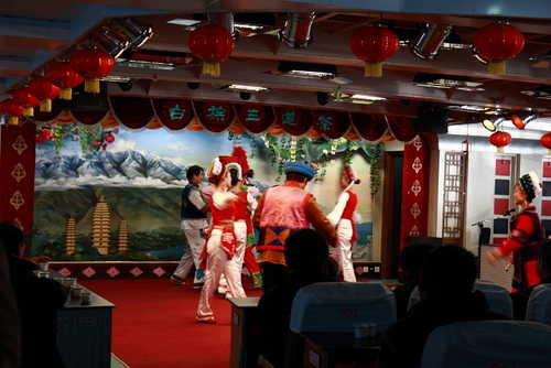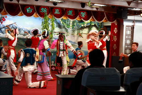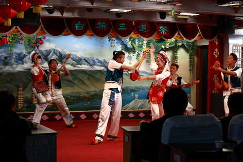 一邊欣賞節目還可品嘗白族的特色: 三道茶--一苦二甜三回味,是用來招待和考驗白族女婿