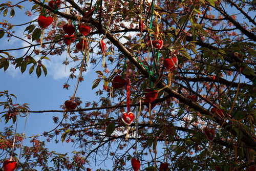 樹上掛滿了香包,應該是一種祈福的方式吧!