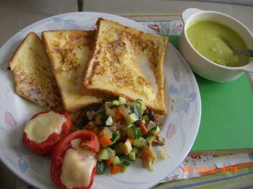 烤番茄.綜合菇類蔬菜丁.法國吐司.還有洋蔥毛豆南瓜濃湯