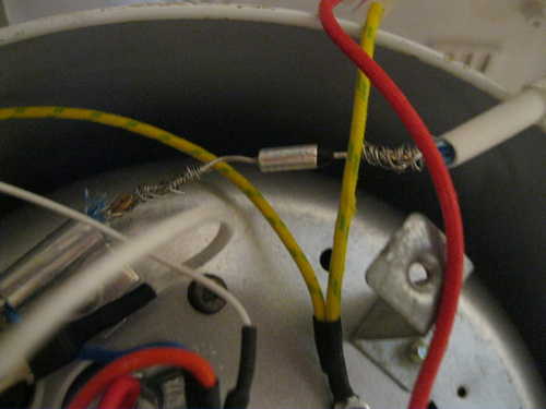 第三步、高手指點第二圈起來的部份,粗的白色塑膠線內藏'溫度及電流保險絲'壞了
