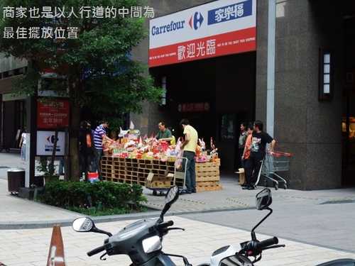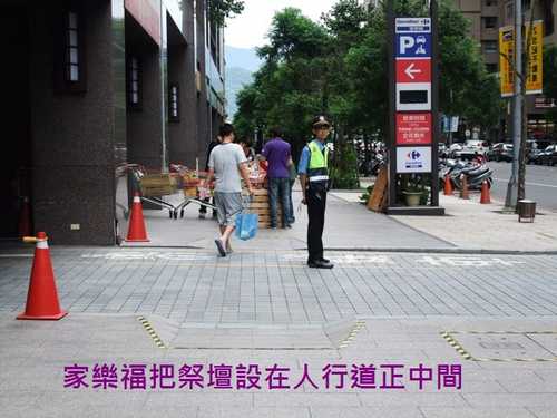 家樂福更是把祭壇設在無障礙坡道的正中間,不論是騎車或是推娃娃車,都得要繞道而行,完全無視民眾的觀感。