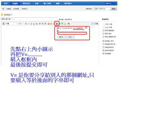 恩嗯~我之前有照你指示按過 但發出後 影片位子都是空白呢 v=要一起貼近空格裡嗎 還是複製v=後面那一串 貼進空格裡
