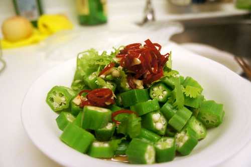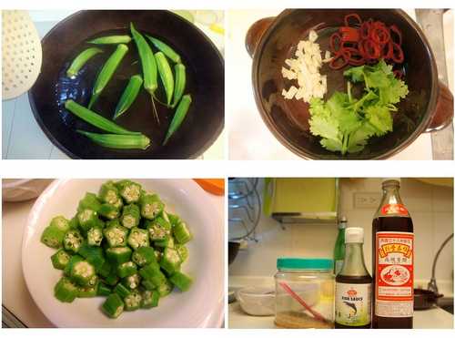 PS:調味料先不要跟秋葵拌勻,調味料中的醋會讓香菜變黑,秋葵也會黃黃滴
