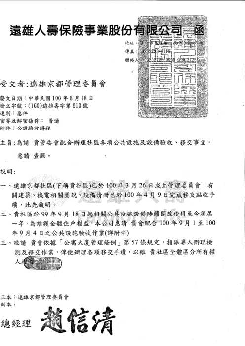 主 旨:為維持貴公司商譽及本社區全體住戶權益,有關公共設施及設備驗收