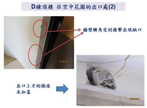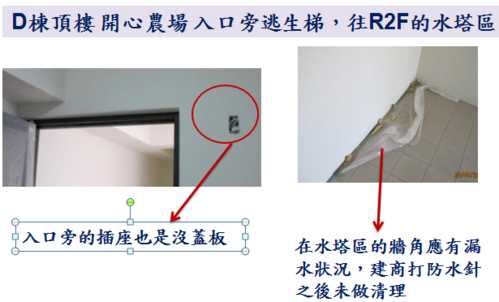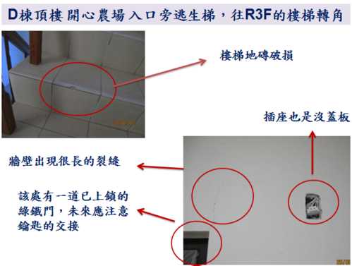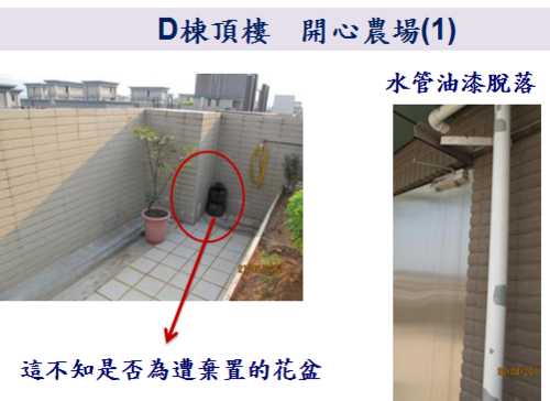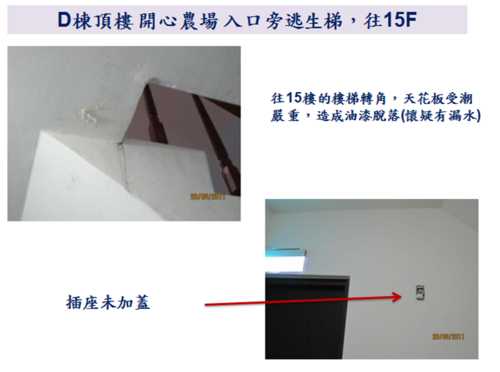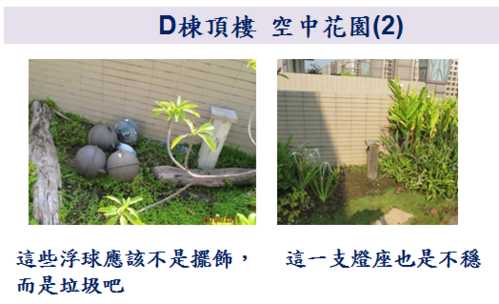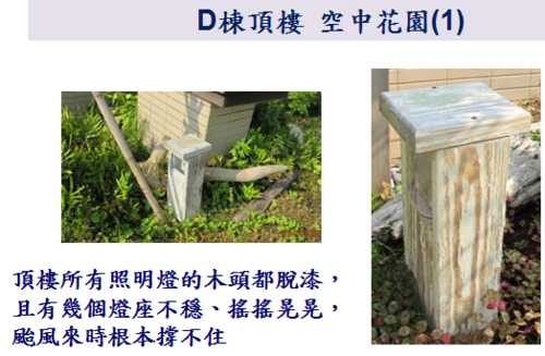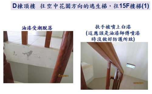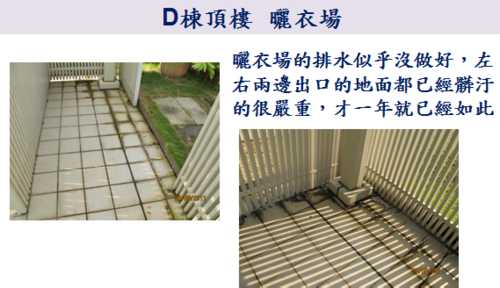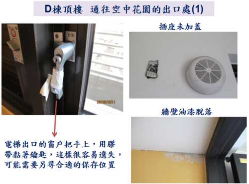 因為9/10就要進行公設的交接了,各委員週週開會很辛苦,因此,小弟就略盡棉薄之力,幫忙撿視一 下D棟各公共區域的問題,如有疏漏的地方,也請D棟的鄰居們幫忙提供喔。