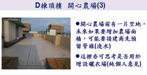 我先從D棟的頂樓開始,分成幾個區域檢視 :