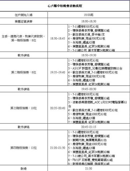 6、 歡迎各住戶於100/9/9之前踴躍提供中秋晚會摸彩贈品,需全新未使用過。請與活動委員唐偲凱聯絡0989-267274,於當天唱名感謝。