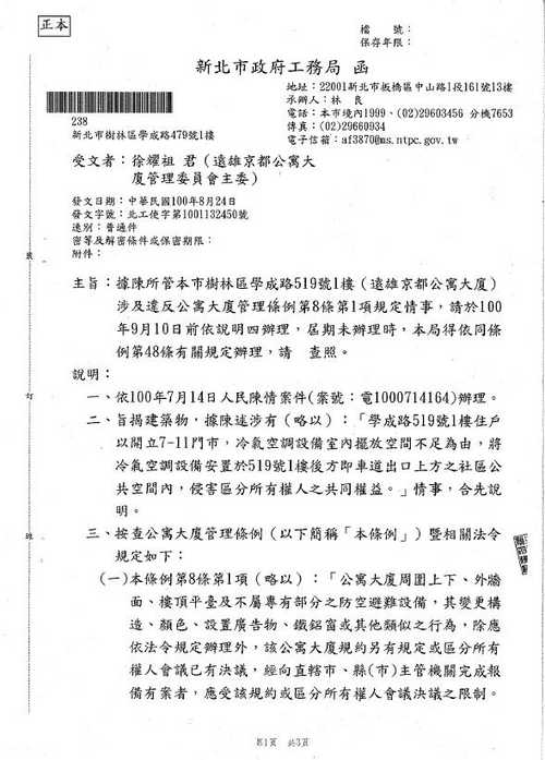 {:4_153:} 其實真正權益受到損害, 被掛在車道上方的機器所排出的熱氣, 受到侵犯的是 車道警衛先生們!{:7_495:} 檢舉人為何不去建築公會 "{:7_346:} {:4_135:} " "大雄" 不建置警衛亭, 讓警衛們 無棲身處(已過了1個冬天&1個夏天了, 現已秋涼了).