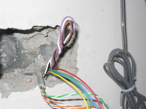 圖片中電話線0.65mm 4P PE-PVC與網路線cat-5穿在同一條管子裡