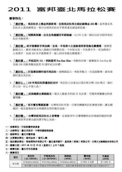 ■ 全程馬拉松組:老手請備2010富邦臺北馬拉松全程馬拉松成績證明。