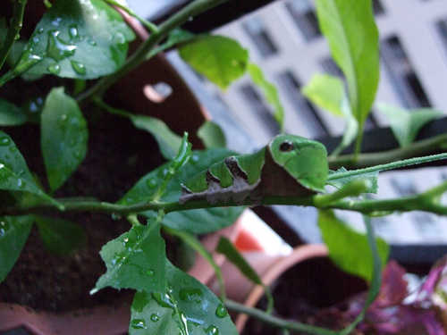 利用假日整理盆栽時才發現細心呵護的檸檬小苗被吃個精光