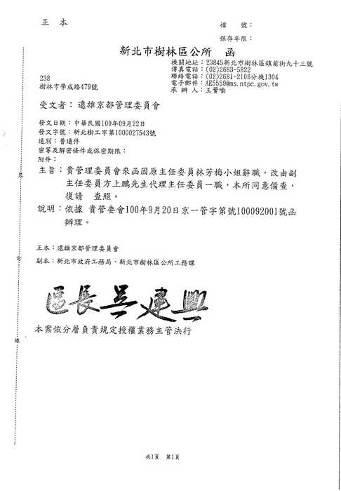 樹林市公所關於代理主委回覆函(2011.9.22)