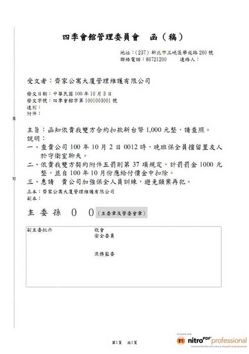 10/2晚班保全留置友人聊天,罰1000元