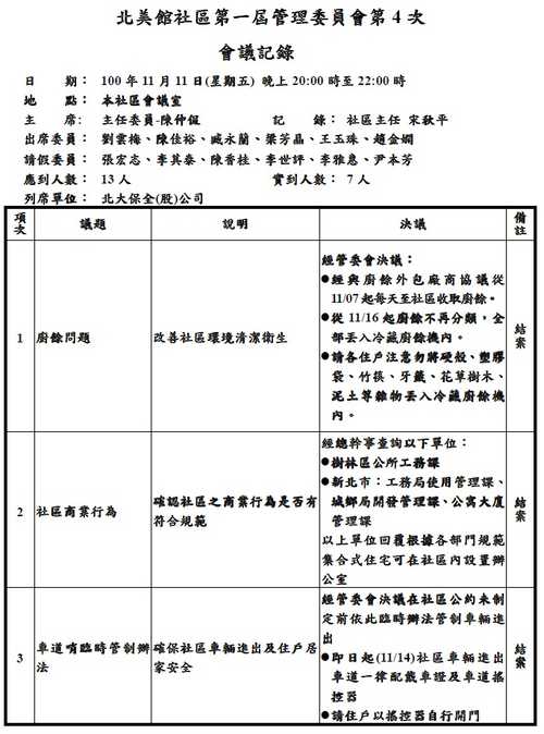 北美館社區第一屆管委會第4次會議記錄