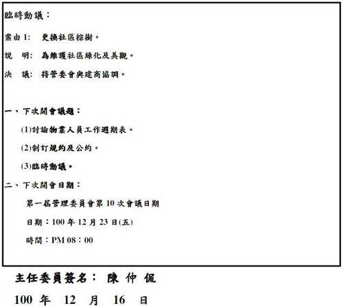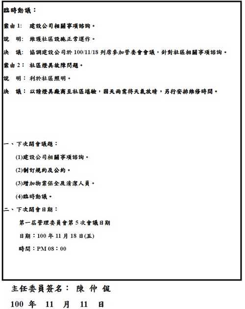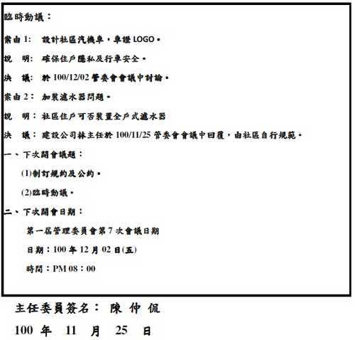 第一屆管理委員會臨時會議 會議記錄