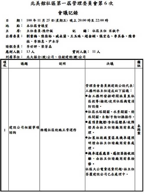 北美館社區第一屆管委會第6次會議記錄