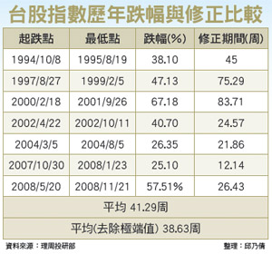 若就時間修正角度來說,跌幅愈重通常修正期間也愈久,例如跌幅最重的2000年空頭走勢,歷時83.71周才來到波段最低點3411點。而根據過去經驗,從起跌點起算,台股在12.14周至83.71周後才能完成落底,平均需花上41.29周,若忽略極端高、低值不計,台股平均修正期間也要花38.63周。也就是說,就歷史經驗而言,當台股出現跌幅25%以上時,大約平均需時38.63~41.29周才能落底。( 理財周刊》