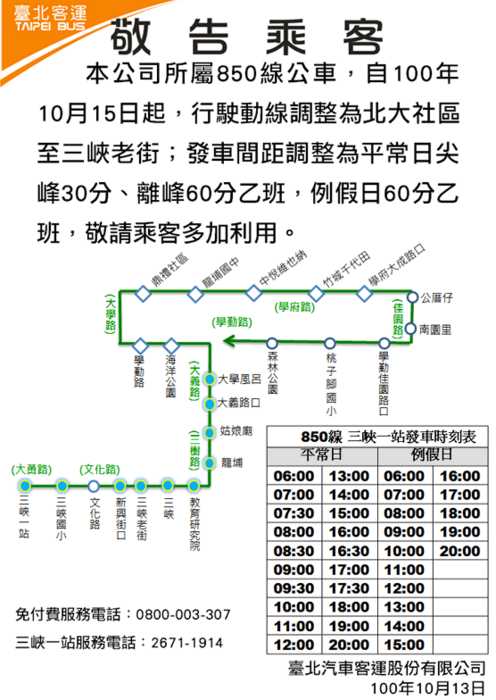 原2輛電動公車規劃配置於鶯歌經三峽到土城捷運永寧站的捷運先導公車,因電動公車於100年5月提前打造完成,故先行駛於850線公車,850線公車配合三峽地區民眾乘車需求,已於100年10月15日起調整為三峽區大勇路─文化路─民生路─三樹路─大義路─學勤路─大學路─樹林區學府路─佳園路3段─學勤路(返程由三峽區大義路─三樹路─民生街─文化路─大勇路),營運班次為一般日40班次、例假日30班次,採一段票收費,讓該二輛兼顧綠能、環保、無障礙等特性之電動公車能更符合民眾的需求,並提供市民更便利、更友善的大眾運輸環境。