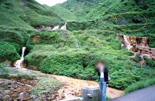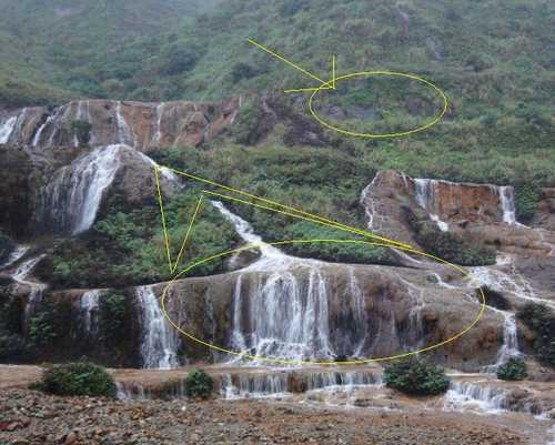 黃金瀑布!! OH.....完全不一樣了, 這個侵蝕地型隨著時間過去, 到底改變了多少?? 我拿一張 1998年 (民國 87年)我拍的照片比對一下就知道了, 地貌完全改觀了, 我用黃圈圈標記起來的大岩石, 看來是沒有變化, 還能與樓主的照片對的起來的參考點...