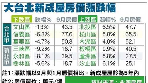 通常量縮會導致價跌,永慶房屋統計今年1~9月5年內新成屋成交價,台北市12個行政區中有7個價跌,其中文山區下跌13%最多,1月每坪50萬元降至9月43.5萬元,其次是信義、萬華區分別下跌6.3%、4.7%;新北市也有半數下跌,以三峽、永和、新莊區域下跌9.2%、8.1%、5.6%,跌幅最深。