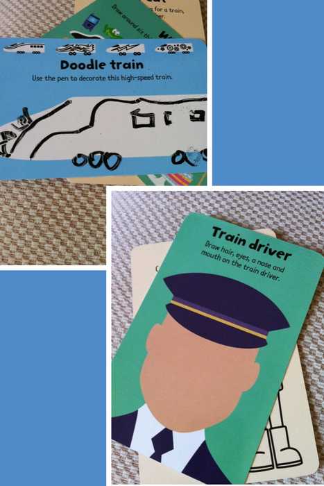 塗鴉的套卡盒裡都有附一枝可擦拭的筆,每張圖卡上面都有說明要怎麼畫或是畫些什麼,譬如Animal Doodles裡面有數字連連看,連出來結果是隻老鷹;有把形狀變成動物的玩法,長方形可以畫成什麼動物呢?如果小朋友一時想不起來,旁邊有範例可以參考;