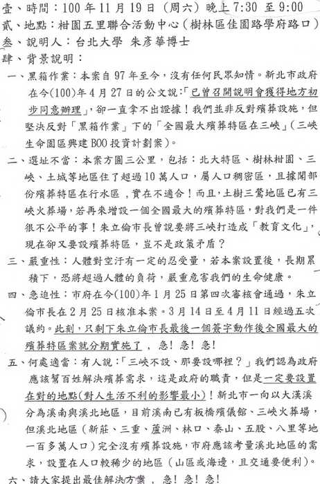 東月 發表於 2011-11-15 08:12 政府在規劃不受歡迎的公共設施時,應考慮搭配民眾喜歡的公共設施,例如將殯葬區設於捷運終點站,國外早有先 ...