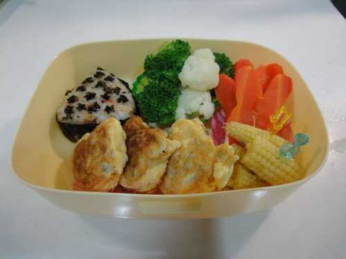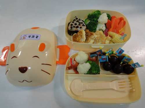 底層是主食>>有小飯糰、花椰菜、兔型紅蘿蔔、熊型吻仔魚蛋(有點失敗)、玉米筍