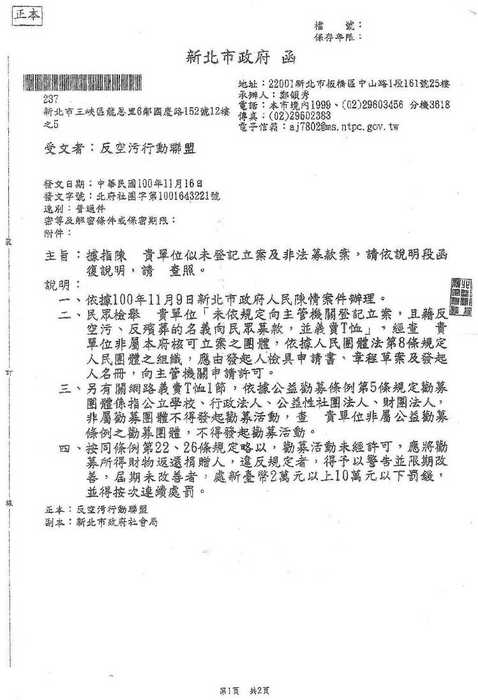 昨天收到新北市政府的通知,有民眾檢舉我們反空汙聯盟並非社會 ...