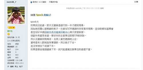 聯盟基於公平性(台下同時也站著其他民意代表),夥伴見狀趕緊商請議員下來,對於議員確實無不敬之意。SPOCK文字表達能力不佳,引起議員誤會或不舒服,小柚子代他再次向議員道歉!!請大人不計小人過囉,煩請陳大哥轉告議員,謝謝!!