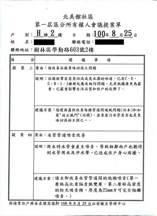 我也從8月25日填寫區分所有權人會議的提案單時,就填過噪音、管道間通風問題,