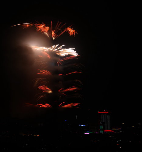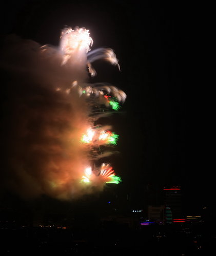 由於風向關係黑煙遮住了煙火的形狀和色彩.又因為風力很弱黑煙無法快速散去以致無法照到煙火全貌.101煙火發射快速.光亮集中.要拍好相當不容易.個人技術成層級有限.拍的不好尚請包涵!