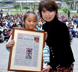 「得獎很開心,謝謝父母及師長辛苦照顧我。」新北市桃子腳國中小四年級學童郭翔芸在全校學生的掌聲中,說出心中的感謝。教育局副局長龔雅雯說,獨臂的郭翔芸能用勇敢、積極的態度,面對人生的困境及不圓滿,是學童學習的楷模。