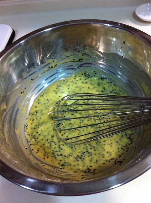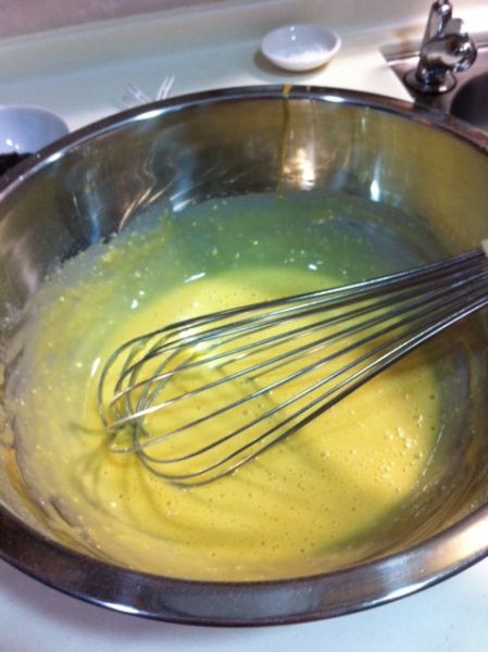 取1/3蛋白糊到蛋黃糊,拌勻,在全部到入蛋白中一起攪拌