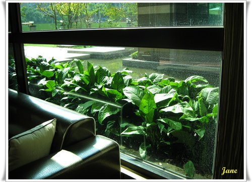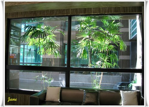 中庭流瀑區的綠色植物 重新栽種後 有著飯店花園的FU....