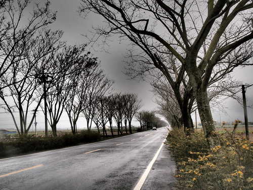 台南後壁車站正前方172甲公路兩旁種植印度紫檀,夏日綠蔭濃密非常美麗,冬日樹葉掉光看起來也別有韻味