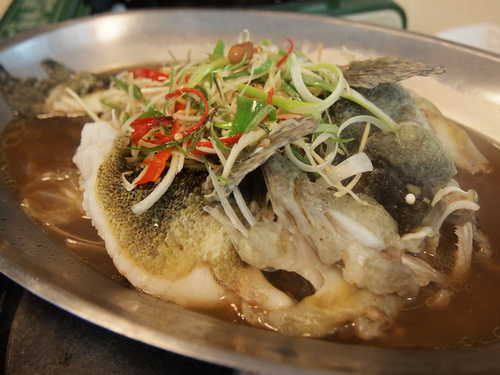 清蒸筍殼魚 -- 噹噹~~主角上場,筍殼魚口感類似石斑,無土腥味,肉質鮮甜細嫩,又無刺