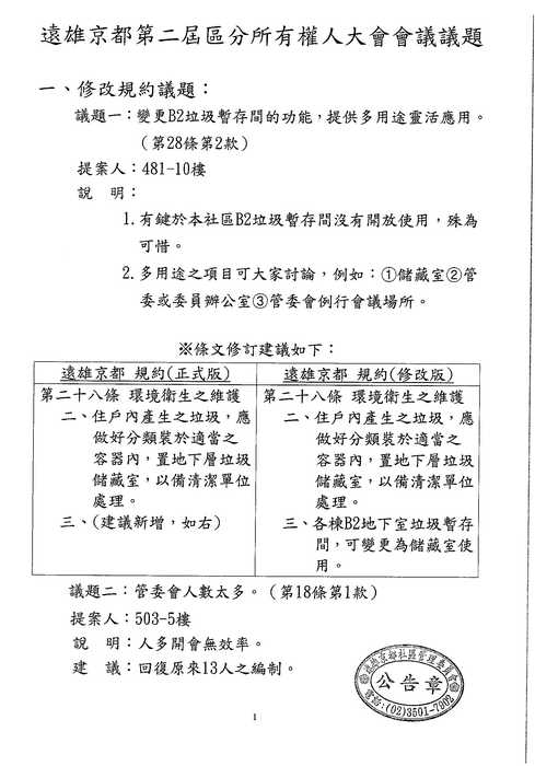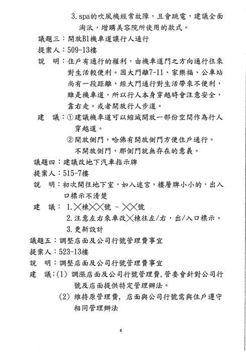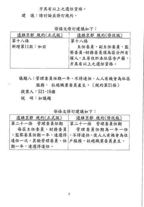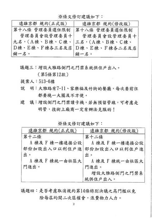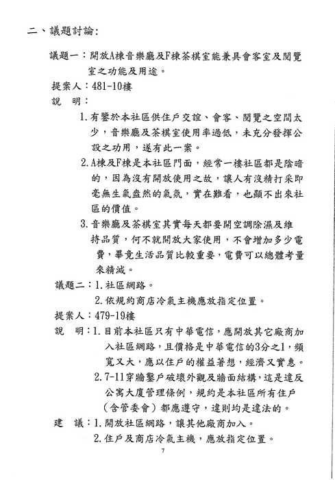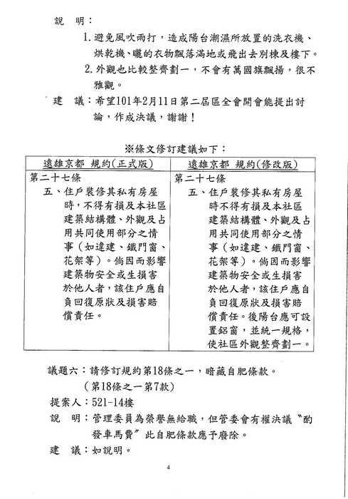 3/10(六)區權會 討論到此議題時, 請主席向住戶們報告一下列規約並澄清: 不論[住戶]or[店鋪]皆無"違反規約", 直接進入7-11表決即可 (如該提案人還要發表言論, 請其自行仔細閱讀規約, 不要浪費住戶的時間了){:7_506:}