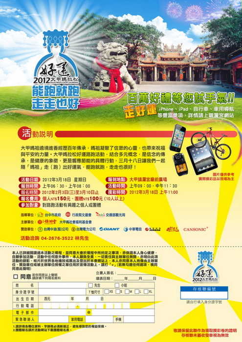 報到地點:大甲鎮瀾宮廟前廣場報到時間:上午6:30-8:00