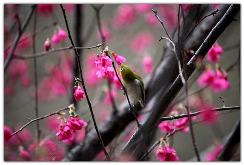 正在拍蜜蜂與櫻花,2隻綠繡眼剛好飛來採食花蜜!!