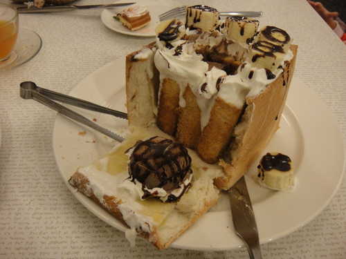 上面放滿香蕉 鮮奶油還有一球巧克力冰淇淋, 再淋上巧克力醬